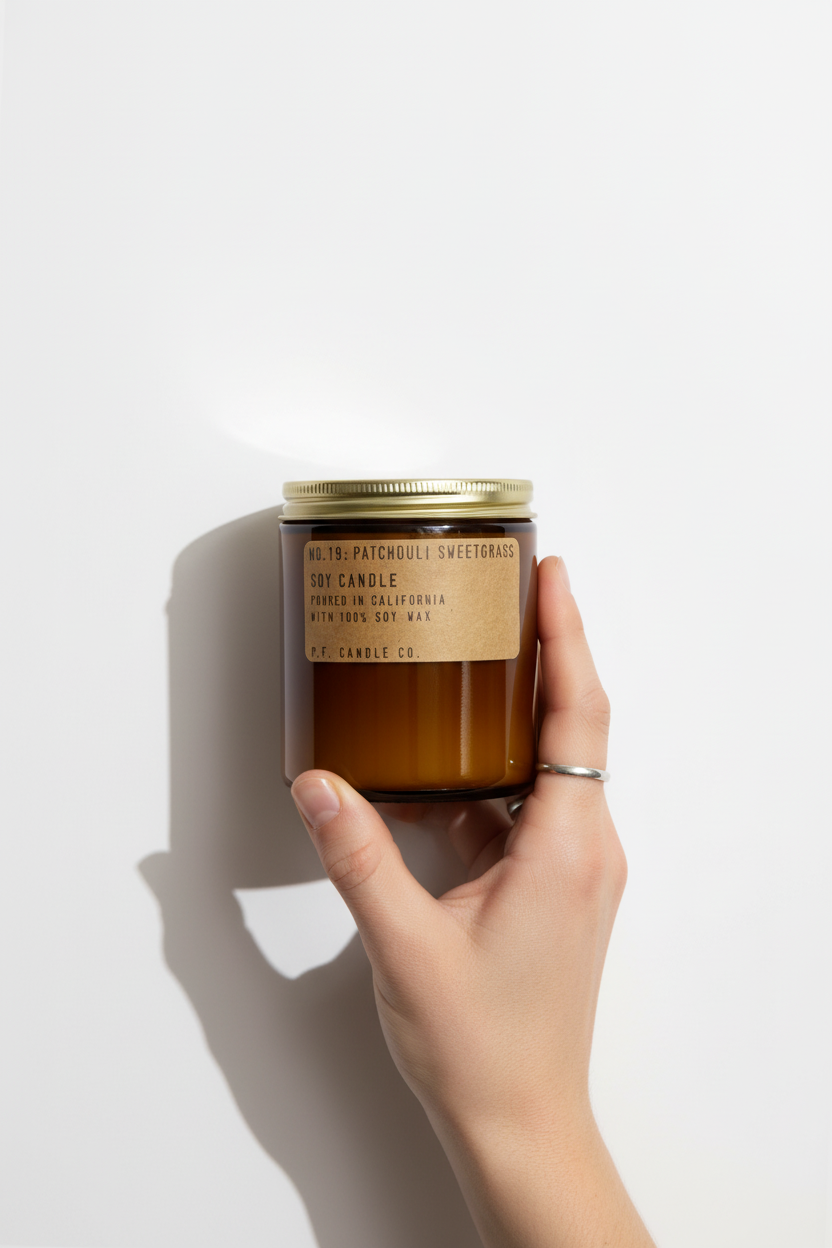 Hand holding Patchouli Sweetgrass candle from bottom
