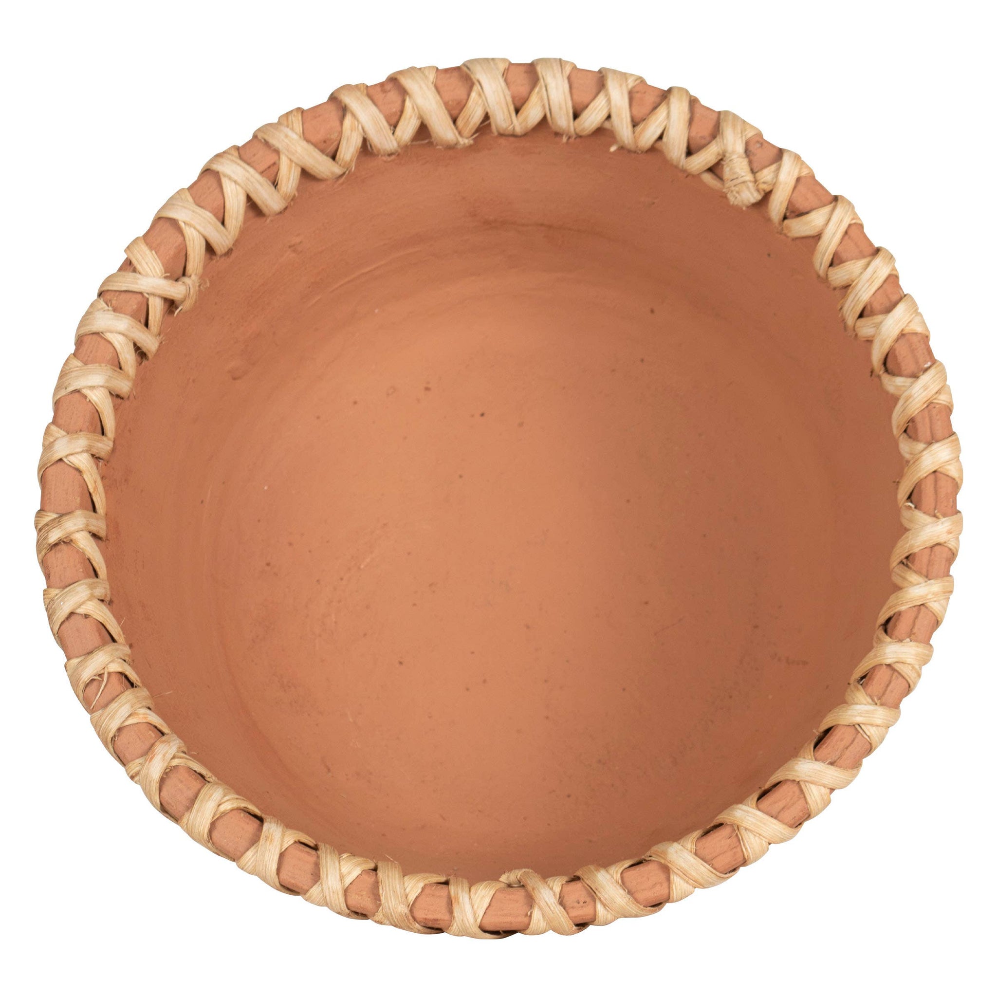 This terracotta bowl makes a statement with the beautiful combination of natural materials. The rust colored, terracotta clay is accented by rattan that is hand woven into the rim of the bowl. Due to the handcrafted nature of this item, no two pieces will be identical.
